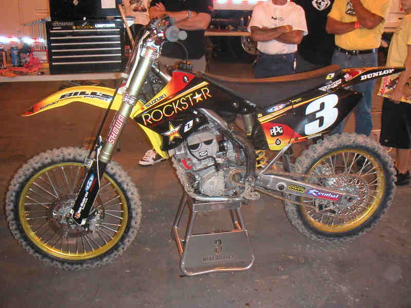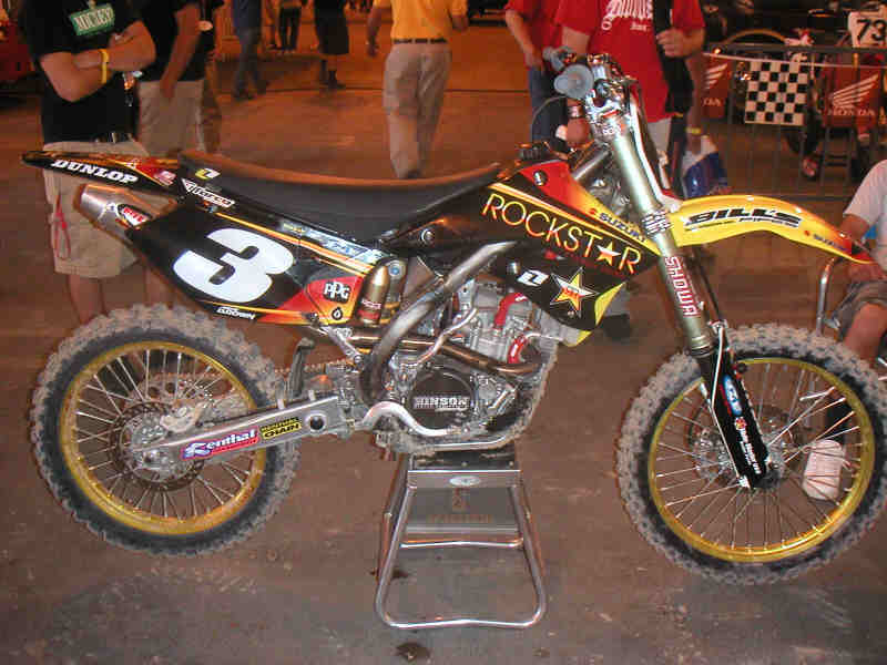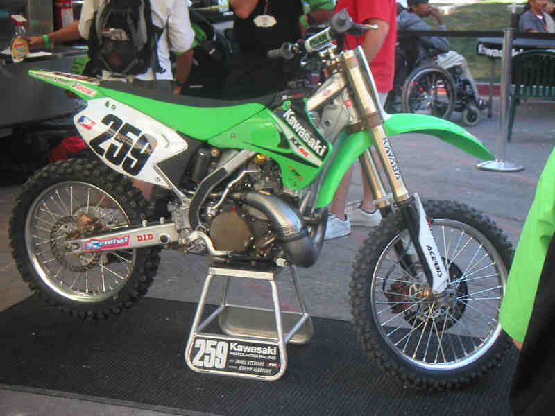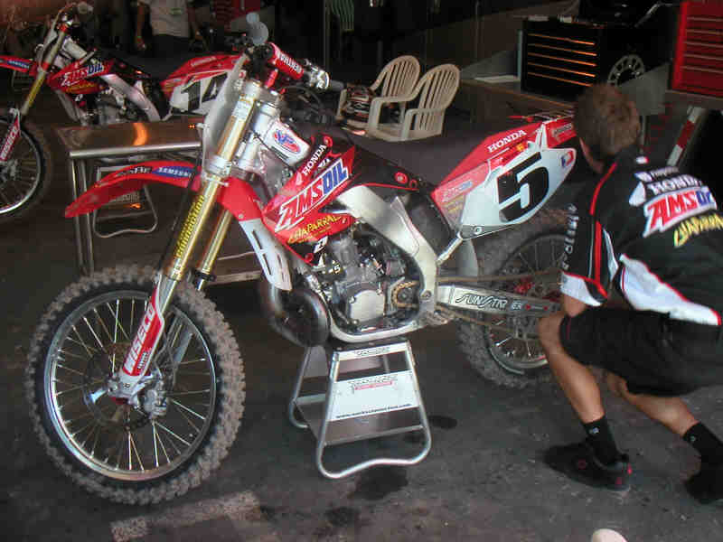 Mike Larocco's CR250, observera original gaffelkronor och gaffelben.